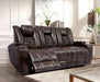 ABRIELLE Dual Power Sofa, 84"L X 40"W X 40"H, 297.62lbs. Enjoy the space-age design and comfort of this multi-functional dream sofa. It features two power recliners with power headrests activated by a simple touch of a button on the cup holders in each arm. The center back cushion has a drop-down table with reading lights, two cup holders, a USB port, and A/C electrical outlets. The lift-up armrests provide storage for remotes, phones, and other accessories. The channel back and seat design adds extra comfort to this sleek styling and it is highlighted with a contrast stitch for added beauty. This high-tech group is covered in rich dark brown faux leather with a three-year wear warranty.