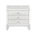 Adding a bold touch of glamour to your boudoir is the Alonza Collection. Finished in a metallic white, the embossed alligator board is reflected in the inlay mirrors of the nightstand. Turned feet provide a distinct departure from the linear design of the collection, adding a distinctly feminine flair. Drawer pulls add to the allure of the collection with an inlay crystal and chrome look.