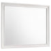 Encourage a glam vibe in your refined bedroom with a modern four-piece bedroom set. Centering on a stylish bed with an upholstered headboard and low footboard, the set includes a two-drawer nightstand for easy bedside storage and display space. A seven drawer dresser and mirror complete the set, adding diamond-like trim across its face that catches the light and offers a sophisticated touch. Bracket feet add a touch of dimensionality and movement to each piece and jewel-like bar pulls add intriguing sparkle. A cool white finish is textured, while white finish trim is smooth, creating a touch of textural contrast that add engaging style.