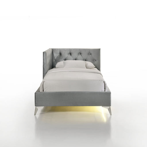 ElementsIndulge in luxury and modern elegance with the unique Amberly Corner Bed. Draped in soft, grey velvet and adorned with diamond shaped-tufted detail...