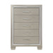 The Platinum 5-Drawer Chest adds instant Platinum to your bedroom! This stylish chest of drawers comes with five, spacious drawers. More than enough space to store all of your belongings. The vertical chest features clean, sleek lines and stylish bracket feet. Mirror glass trim accents the front of the chest, while chrome drawer handles with crystal-like accents bring the glam to your bedroom. This chest of drawers is finished in a chic, champagne color making it easy for this style to transition with every style phase you go through. Features: • Chic Champagne Finish • Glamourous Chrome Handles With Crystal Accents • Mirror Glass Trim • Stylish Bracket Feet • Includes Tipping Restraints • 37"W x 18"D x 53"H • Due to lighting, product color may slightly vary from images. Dimensions: Depth: 18.0" x Width: 37.0" x Height: 53.0" Weight: 164.0 lbs.