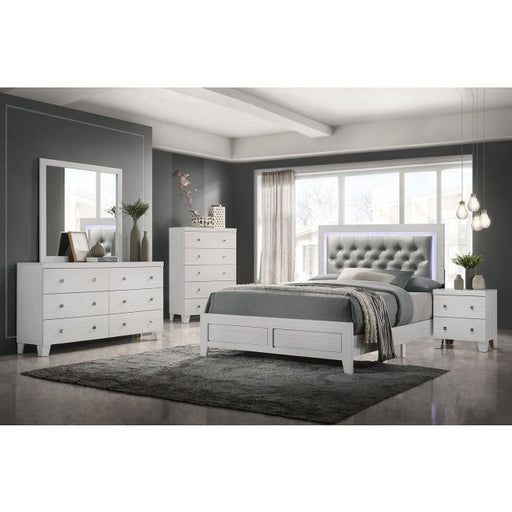 Merrilee Collection by ACME Furniture Modern casual style Oak finish Panel headboard w/ shelf Low profile storage footboard 2 Drawers Center meta...