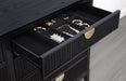 Dress up your bedroom with the impeccable texture and styling of a modern eight-drawer dresser and mirror. Vertical fluting decorates each drawer front and crowns the mirror, offering a refined, artistic touch that elevates without overwhelming. A black finish is rich and deep, perfect to blend with a variety of existing decor and furniture pieces. Its drawer fronts feature vertical fluting details and half-moon handles in a golden finish, delivering the perfect blend of contrast and texture. A framed mirror on top completes the look and offers reflectivity and depth in your bedroom. Key Features: • Chic fluting adds depth and dimension to a modern eight-drawer dresser and mirror • Includes eight drawers of various sizes to accommodate all your clothing and accessory storage needs • Black finish is rich and deep, complementing in many different bedrooms and dressing areas • Half-moon drawer handles are warm and inviting, with a gold finish that adds contrast and dimension • Top drawers include felt lining that offers protection to delicate items, jewelry and accessories • The beveled mirror creates an illusion of depth and dimensionality