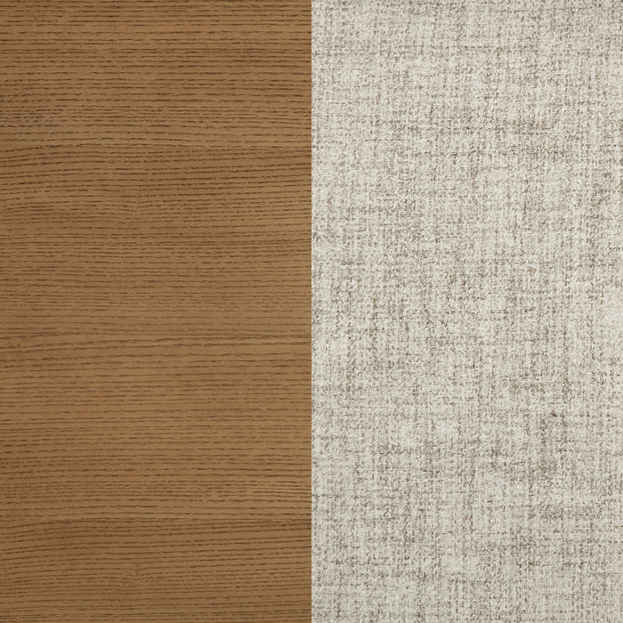 Soothing natural, neutral hues introduce refined style to a modern room set. Offering a soft natural brown wood grain finish over ash veneer and rubberwood, the set delivers an inviting, approachable ambiance to your kitchen or dining room. The table features a spacious rectangular tabletop with angled legs and an angular apron, creating eye-catching flair. Chairs offer soft oatmeal fabric upholstery over plush foam padding, and feature wooden ladder details on chair backs, adding a sense of character and structure. This charming set is a perfect choice for a family dining room. Key Features: • A modern wooden dining set with a rectangular table seats four to six of your favorite people • A natural wood finish is a versatile choice for a stylish and approachable dining room or kitchen • Table has angular details and legs set at a 45-degree angle to create eye-catching flair • An outer ladder back design pairs with foam cushions and soft oatmeal fabric upholstery • Crafted from ash veneer with rubberwood and engineered wood for optimal durability and style