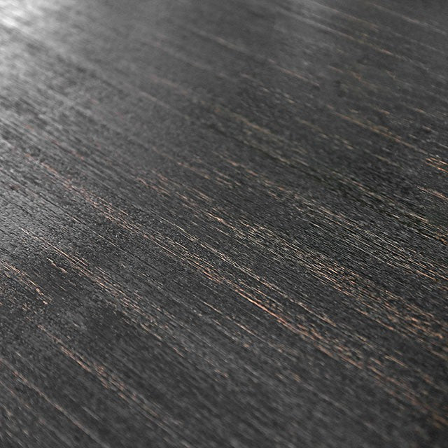 Rustic charm meets upscale design in the form of this stunning collection. The rustic wood grain and antique black finish take you to a charming farmhouse somewhere in the countryside, achieving an inviting, homey atmosphere that will have family and friends coming back for more. Elegant beige linen-like chairs add sophisticated appeal with their wingback sides, button tufting and nailhead trim.